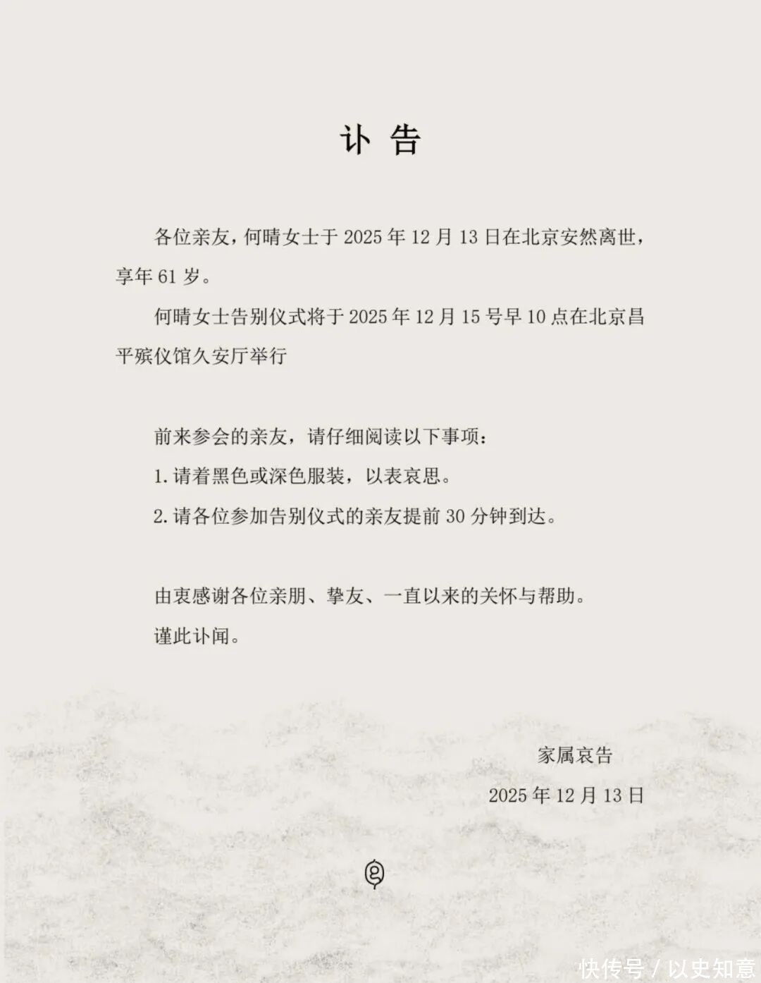 备受尊敬的表演艺术家何晴于北京平静离世,享年61岁。这位曾用无数经典角色打动观众的女演员,最终在亲人的陪伴下走完了人生最后一程。