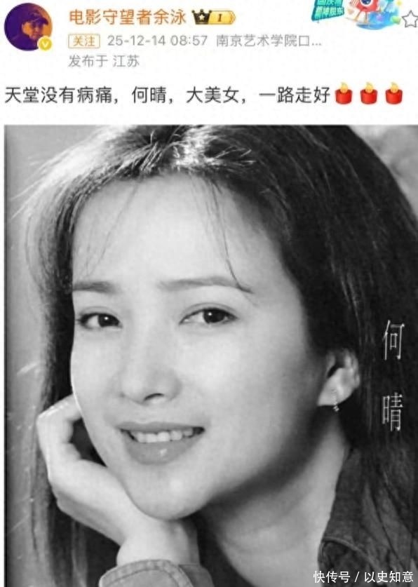 消息最初由微博账号“电影守望者余泳”发布,配图为何晴一帧黑白肖像——面容温婉、眼神清澈,一如她留在荧幕上的模样。